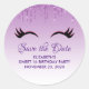 Save the date stickers with a trendy stylish design. The background is a purple gradient color with an image of faux sparkling glitter dripping down from the top. A pair of girly cute eyelashes underneath the glitter image.