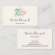 Business cards with a pretty watercolor illustration. A flower bouquet with pink and blue flowers surrounded by green leaves and sprigs.