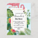 Baby shower party invitation postcard with a cute and whimsical pink flamingo. Surrounded by green tropical leaves, and red and yellow hibiscus flowers. A square gold gradient frame in the center.