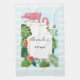 A kitchen towel with a cute and whimsical pink flamingo. Surrounded by green tropical leaves, and red and yellow hibiscus flowers. A rectangle shaped, gold gradient frame in the center.