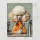 A perfectly groomed poodle sits confidently in a salon setting, holding a comb while surrounded by professional grooming tools. The dog’s fluffy and voluminous fur is styled to perfection, creating a luxurious and elegant look.
