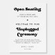 Open seating & Unplugged ceremony wedding sign. A retro chic theme: adopt this slightly vintage and stylish typographic design for your wedding stationery, with a classic black and white theme. Customizable text colors and backgrounds.