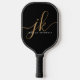 Stylish personalized custom color pickleball paddle featuring monogram initials shown in an editable handwritten script and name in changable black, gold and white colors to create your own custom design for the pickler or pickleball player. COLOR CHANGES: Change any text or background colors or add a styled graphics background by clicking on the EDIT tab in the PERSONALIZE section. PADDLE OPTIONS: Choose from Black, Tan or White edging and grip colors on the ordering page. ASSISTANCE: For help with design modification or personalization, color change, transferring the design to another product or if you would like coordinating items, contact the designer BEFORE ORDERING via the Zazzle Chat MESSAGE tab below or email makeitaboutyoustore@gmail.com.