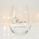 Chic stemless wine glass for your maid of honor, bridesmaids, or other members of your bridal party to celebrate with at your bridal shower, bachelorette party, rehearsal dinner, wedding reception and other wedding events. Personalize with her name in a minimal modern calligraphy script and her role in elegant serif typography. A perfect gift for your maid of honor, bridesmaids, family members, etc.