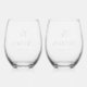 Chic monogram wedding 2 stemless wine glass set with your married last name in a stylish signature script and your wedding date in simple modern typography.
