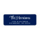 Modern navy blue return address label with your name in a stylish white script and your address in simple white lettering.