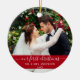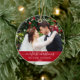 Elegant Stylish Trendy Script Our First Christmas Wedding Photo Red Ornament with Snowflakes back