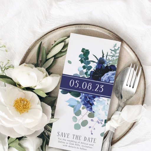 This elegant soft blue and grey design features an blue ribbon like band, gum leaves, hydrangeas, peonies and thistle in a boquet. It is a semi-formal, easily editable design which is fresh, vibrant and modern, but also suitable for a more rustic wedding or occasion.