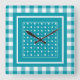 A stylish, square Wall Clock, with a teal and white check gingham pattern.