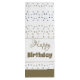 Tall paper gift bag with handles, tote style with all over star print in silver grey taupe and blue. The white background and accent stripe can be switched to any colour to coordinate with your style, and the happy birthday text can be personalized to suit any special occasion.