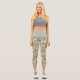 Stylish leggings printed with an Anne Londez Halloween pattern inspired by steampunk & victorian aestethics, featuring trailing skull vines with spiders in orange on a trendy distressed sage green linen-textured background
