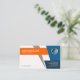 Design features bold, sharp, colorful trapezium shapes to make you stand out. Your prestigious name and job title rest in a dark orange column at the top. The optional logo and contact details are housed at the trapezium shapes towards the right side of the card. A slogan to advertise your services lie at the lower left corner.