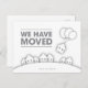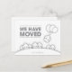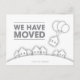 Customize this Stylish Clean New address Announcement Postcard featuring a lovely designed original image made with white houses and shadows, one of the houses is high up in the air as it is attached on three balloons which are taking it to a new place. On the left side is modern big grey text: "We have moved". Under the image is customizable text: "Visit us soon!". Make sure to customize all the text on the front and on the back side of this postcard. Very contemporary and minimalistic design, perfect also for your business.