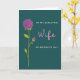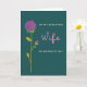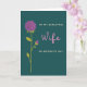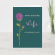 This greeting card features a deep teal background with a large purple flower in the upper left, its curled petals drawn in smooth, swirling lines that feel like a gentle embrace ❤️. A smaller purple bud sits lower on the stem, tucked near a branch as if leaning in close for comfort. The tall stem and slim leaves rise in lime green, guiding your eye upward and giving the layout a calm, steady rhythm. On the right side, the words “TO MY BEAUTIFUL” appear near the top in cream lettering, and “ON MOTHER’S DAY” sits below in the same cream tone, keeping the message balanced and easy to read. The word “Wife” is placed between them in soft pink, larger than the other lines, adding a tender, affectionate focus without crowding the artwork 🌼. The mix of teal, purple, green, and pink feels softly romantic, like a quiet moment shared between two people who know each other well. The flower’s main bloom tilts slightly toward the text, creating the look of a gentle glance across the card. Fine petal curls and thin leaf veins stand out crisply against the dark teal field.