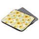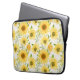 Illustration style graphic of yellow sunflowers with leaves and stems on white background, seamless repeat pattern
