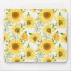 Illustration style graphic of yellow sunflowers with leaves and stems on white background, seamless repeat pattern