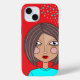 Colorful, bright, abstract design of a stylized face of a girl with stripy brown hair, with a red background and stars.
