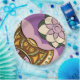 This artwork features a stylized axe and a flower, each rendered in a flat, geometric style with bold outlines. The axe has an ornate design with a brown handle and a yellow and brown head, decorated with circles and lines. The flower has light purple petals and a yellow center, with a few green leaves. The background is a solid purple color, and the axe and flower are placed asymmetrically. The overall design is decorative and eye-catching, combining elements of nature (the flower) and human craft (the axe) in a stylized and somewhat abstract manner. The contrast between the sharp, angular axe and the soft, rounded flower creates visual interest.