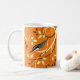Decorative Red Breasted Nuthatch mugs with orange background and leaf pattern around branch swirls