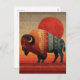 This striking image presents a stylized bison (buffalo) adorned with intricate Native American-inspired geometric patterns in a rich palette of earthy oranges, blues, and browns. A vibrant red sun rises behind the powerful animal, set against a textured, layered landscape of warm hues, evoking themes of Western wildlife, indigenous art, and spiritual connection to nature.