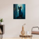 A stylized digital painting of a black cat with piercing yellow eyes, seated against a moody abstract background of teal, blue, and orange. The expressive brushstrokes and shadowy tones evoke mystery and elegance. This piece blends realism with atmosphere, perfect for lovers of feline art and dark aesthetics.