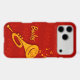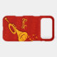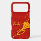 A red and gold stylized brass trumpet musical instrument personalized iphone case. Personalise this item with your name. This example reads Bailey. A perfect gift for brass instrument players.