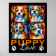 This is a cute poster perfect for a dog lover featuring 4 adorable stylized puppies in vibrant colors and the words "Puppy Love" with dog paws.