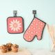 Add a touch of elegance to your kitchen with this charming oven mitt and pot holder set featuring beautiful floral designs. The oven mitt showcases a pattern of stylized peach and cream flowers against a vibrant coral background, creating a delightful and lively look. The matching pot holder is adorned with a large cream-colored daisy with a peach center, also set against a coral background, bringing a coordinated and stylish flair to your cooking essentials. Customers can choose between black silicone or silver quilted material on the back, offering both functionality and style to suit their preferences. Whether you're baking, cooking, or grilling, this set provides the perfect blend of protection and aesthetics. Elevate your kitchen decor with this lovely oven mitt and pot holder set, designed to make your culinary experience both beautiful and practical.
