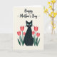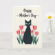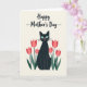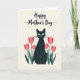 This card features a sleek black cat drawn with minimalist lines, sitting calmly as if keeping loving watch ❤️. Its bright aquamarine eyes and small pink heart-shaped nose give it a gentle, affectionate look that feels like a quiet bond between friends. Around the cat, stylized flowers bloom in coral and soft salmon tones, rising on slender emerald stems like a spring garden arranged just for someone special 🌼. The background is a warm cream color that keeps the scene airy and focused on the cat and blossoms. Near the top, the words “Happy Mother’s Day” are placed above the illustration in a dark, flowing handwritten style that stands out clearly. Subtle shading adds a little depth to the cat’s silhouette and the petals without making the artwork feel heavy. The composition stays centered, with the cat framed by the floral cluster and plenty of open space around it. The flowers gather in a loose bouquet at the bottom, with several blossoms reaching upward toward the text.