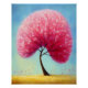 The motif shows an elegantly curved, dark tree trunk, the crown of which spreads out in a distinctive, almost heart-shaped fan shape. The dense crown consists of countless fine branches and small pink flowers or leaves, which create a soft, almost cloud-like texture. The tree stands on a simple, ochre-colored ground surface against a softly graduated, light blue background, giving the entire motif a harmonious and calming effect.