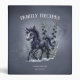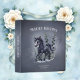 Stylized unicorn in floral splendor. This artwork depicts a stylized unicorn with dark gray fur and a silver horn. Purple roses adorn its neck and head, creating an elegant, prestigious aura. Large, expressive purple eyes and a gentle smile lend the motif a friendly, inspiring touch. The background with stylized dark blue flowers and green stems creates a dreamy, floral atmosphere.