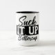 This mug features a bold and sassy design with the phrase "Suck It Up Buttercup" prominently displayed. The playful and empowering message is perfect for those who need a little extra motivation to tackle their day with confidence and determination. The vibrant text stands out against the white background, making it a stylish and eye-catching addition to your coffee or tea routine.