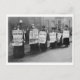 Reproduction of a photograph shows Suffragettes carrying signs, one of which says: Votes for Women!