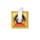 Sugar skull in the center of a circle of small black with white skulls and three yellow burning candles. "This is from the Day of the Dead also know as Dia de los Muertos sugar skulls .