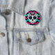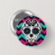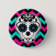 A sugar skull with black, hot pink, and turquoise accents on a chevron pattern background in matching colors. Shown here on a pin on button.