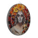 A celebration of life and death is a sugar skull lady—a striking embodiment of both beauty and mortality. Her face is intricately adorned with vibrant Día de los Muertos patterns. Her eyes are surrounded by petals reminiscent of marigolds. Cascading from her hair are colorful flowers and a skull with hollow eye sockets.