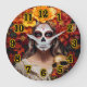 A celebration of life and death is a sugar skull lady—a striking embodiment of both beauty and mortality. Her face is intricately adorned with vibrant Día de los Muertos patterns. Her eyes are surrounded by petals reminiscent of marigolds. Cascading from her hair are colorful flowers and a skull with hollow eye sockets.