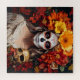 A celebration of life and death is a sugar skull lady—a striking embodiment of both beauty and mortality. Her face is intricately adorned with vibrant Día de los Muertos patterns. Her eyes are surrounded by petals reminiscent of marigolds. Cascading from her hair are colorful flowers and a skull with hollow eye sockets.