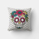 Sugar Skull with colorful flowers on a pillow. Day of the Dead decor. Customize with your own text.