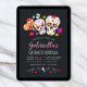 Plan your Day of the Dead theme quinceanera birthday party with these cute invitations featuring festively decorated sugar skulls and brightly colored flowers. Personalize with your Día de Muertos themed quinceañera details in white and pink lettering on an off-black background.