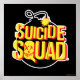 Yellow and Orange Suicide Squad logo within a black bomb on white and black backgrounds.