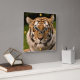 10.75” x 10.75” acrylic wall clock with an image of the head of a handsome Sumatran tiger. Gold orbs mark the 12, 3, 6, and 9 positions.