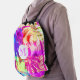 This drawstring bag features your monogram initial on a bright pink, blue, and yellow abstract Hawaiian palm tree tropical pattern. Create for yourself or give as a gift.