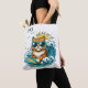 Tote bag featuring a cute kitty with sunglasses on a surf board on the waves in the ocean with a warm summer sun. Perfect for a trip to the beach or for someone who loves surfing or watching surfers.