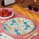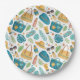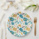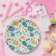 Vibrant seamless summer pattern paper plate featuring straw hats, sunglasses, tote bags, sunscreen, flip flops, tropical leaves, and flowers on a clean white background. Ideal for beach lovers, vacation fans, tropical style enthusiasts, and anyone who loves sunny summer aesthetics.