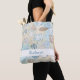This fun personalized coastal themed tote bag is perfect for summer, with a pattern of hand drawn seashells in shades of blue and brown, with an aqua and sand colored abstract background.