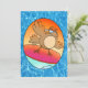 Cool, colorful surfing bird riding a wave on a surf board in summer heat.