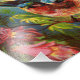 This colorful print illustrates a bluebird resting on a branch in a flower filled forest. This view shows the bird as it is about to take flight. Bright blue, pink, yellow and green colors make an exciting image for decor and personal accessories.