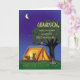 If you are looking for a sweet card that you would like to send to your child, grandson, grandchild or friend to summer camp, have a look at this one. This cute, whimsical Design shows a squirrel and a rabbit in a tent. You can recognize their silhouette, since they are playing with their flashlights. The tent is under a tree with an owl. You see a campfire that is almost extinct. Write this card to a child that is in Summer Camp