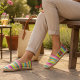 These shoes are amazing, well constructed, vivid color durable fabrics, can wear comfortably without socks…and pick your liner color. I ordered several and wore all Summer into Fall. A GREAT choice and hundreds of fabrics to choose from! Thanks so much to the designers…a real winner!! Order one size up to wear with socks. Usual size is snug at first but does stretch after several earrings. .